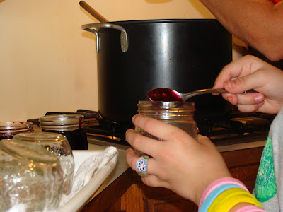 The kids helped fill the jars, and Grandma and I had so much fun in the kitchen together that afternoon. It was so surreal at times... I can remember my mom and my grandma standing in the kitchen cooking, canning, talking, and spending time together. There were a few moments that I had that "oh this is like de ja vue... cept it's Grandma and ME... who is reminding me of my MOM!" Weird, but cool, but sad. Anyway. We did have a great time. I liked her little canning tools. Antiques, I'm sure. But practical and neat! My Grandma Rada is so fun. Neat. Funny. Smart. Good and what she does. Does what she loves. Loves what is good. Like JAM! Yum!